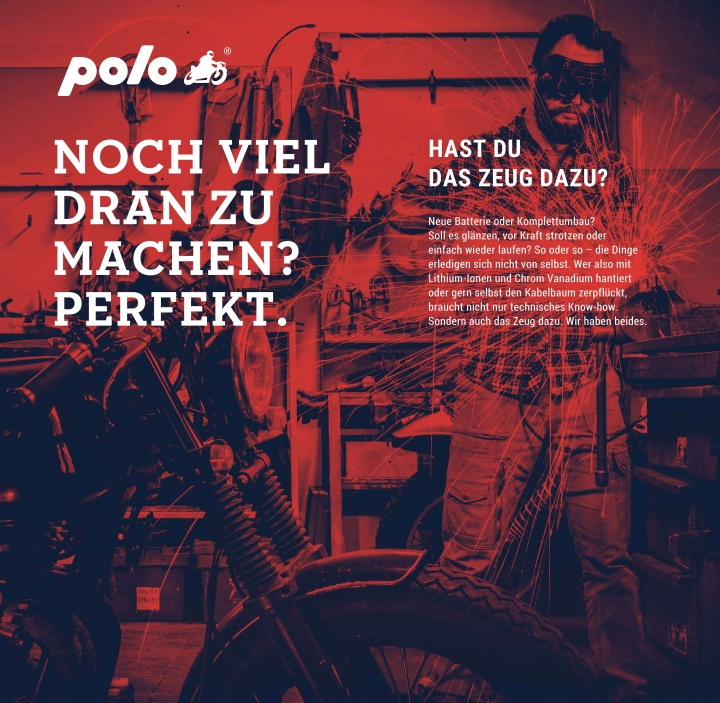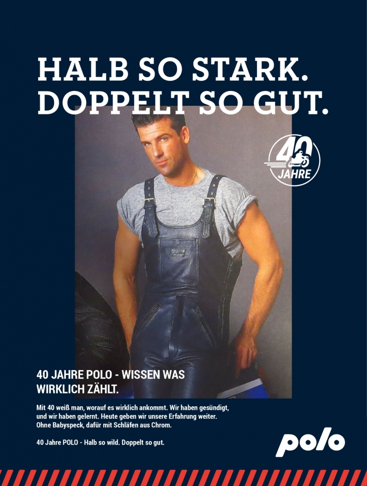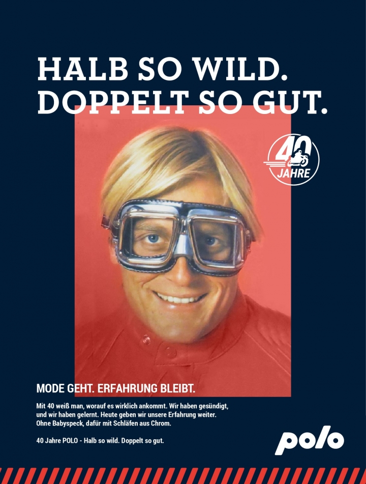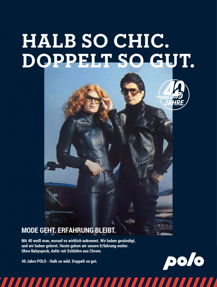 Idee: POLO wird 40 – aber halb so wild. Denn mit dem Alter kommt die Erfahrung. Und die kommt den Kunden zugute. Pünktlich zur Neupositionierung – weg vom Gleichgesinnten hin zum modernen Servicedienstleister – bringt die Jubilläumskampagne beides zusammen. Inklusive eines zeitgemäßen Seitenhiebs auf die Männerdomäne Motorrad. Die Originalmotive vergangener POLO-Kataloge demonstrieren eindrucksvoll: Früher war nicht alles besser … Gut so. Zeiten ändern sich, Erfahrung bleibt.