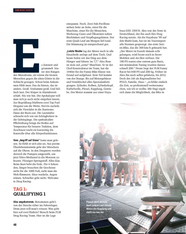 “Beim Start bebt die Erde. Für vier Sekunden, länger brauchen die Geschosse nicht für die 1000 Fuß, sieht man die Welt flimmern. Sitze wackeln. Augen tränen. Schneller geht nicht. Welcome to Drag Racing. …”