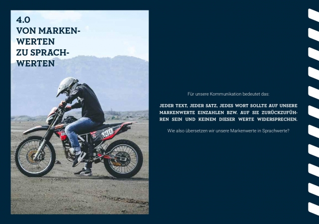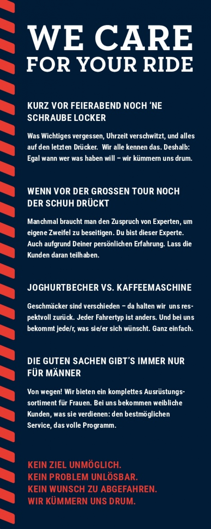 “Vorne Business, hinten Party – vor exakt 40 Jahren hat alles angefangen. Das Feuer. Die Leidenschaft. Die Professionalisierung dessen, was uns bis heute die Falten straffzieht. Seit 1980 haben wir es uns zur Aufgabe gemacht, euch mit allem auszurüsten, was ihr zum Motorradfahren braucht. Vieles hat sich seitdem verändert: der Look, die Technik, die Möglichkeiten. Das Gefühl aber ist geblieben. Unsere Jubiläums-Kollektion verbindet beides: alte Leidenschaft mit neuer Technologie. Enjoy the ride!”