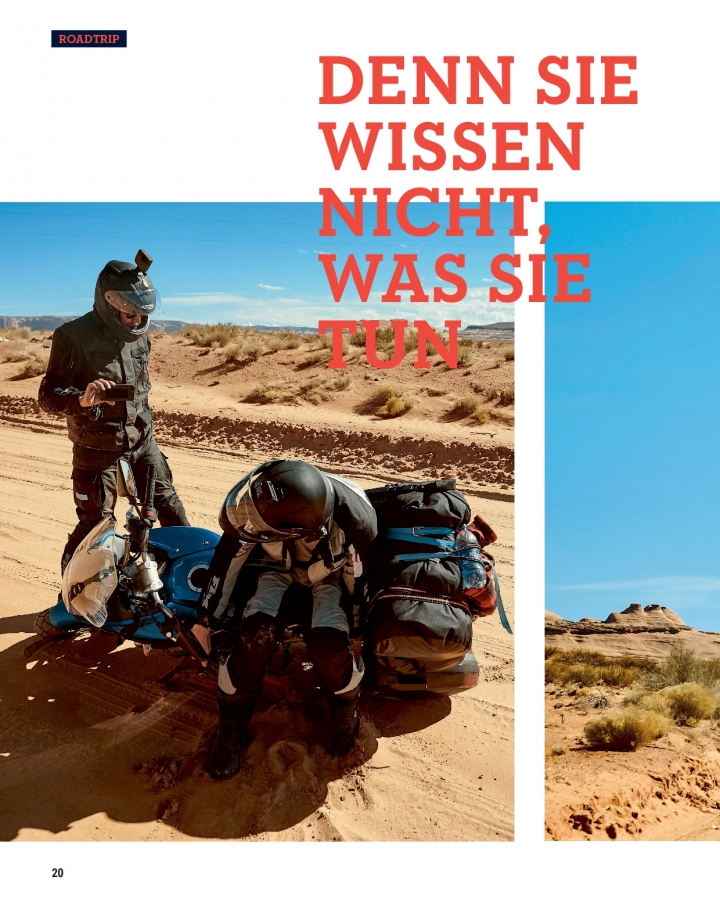 “Erschöpft rollen wir um 23:30 Uhr ein Motel an. Auf dem Hof steht eine einsame Harley – und ihren Besitzer hat uns der Himmel geschickt. Dave: 1,65 Meter, 180 Pfund, schwerer Gang und eine Stimme so tief wie das Erdreich. Ein Vollblutbiker, der uns gerupfte Motorradküken unter seine Fittiche nimmt. Nachdem er sich zum Frühstück zwei Bourbon und ein Bier genehmigt hat, fährt er vor, zeigt uns die Kniffe, „damit die Cops nicht gleich schießen.“ Dave gibt uns Selbstvertrauen in den Kurven, erzählt uns, was es heißt, auf dem Bike das Land zu durchqueren. Zum Abschied kriegen wir jeder noch einen Skorpion-Lutscher, dann ist Dave weg. Und wir sind noch da.”