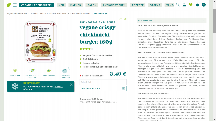 Was ist außen knusprig-crunchy und innen saftig-zart wie feinstes Hühnerfleisch? Na klar, der vegane Crispy Chickimicki Burger von The Vegetarian Butcher. Die leckerste Fleisch-Alternative seit es vegane Metzger gibt! Zum Grillen, Braten, Backen oder Frittieren. Dann zwischen zwei flauschige Buns legen, mit Burger Sauce, Ketchup und/oder veganer Mayo verzieren, Augen zu und geschmacklich im Chicken-Burger-Himmel landen.